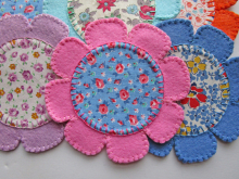 Felt flower mug coasters with coordinating vintage fabric centers and embroidery.