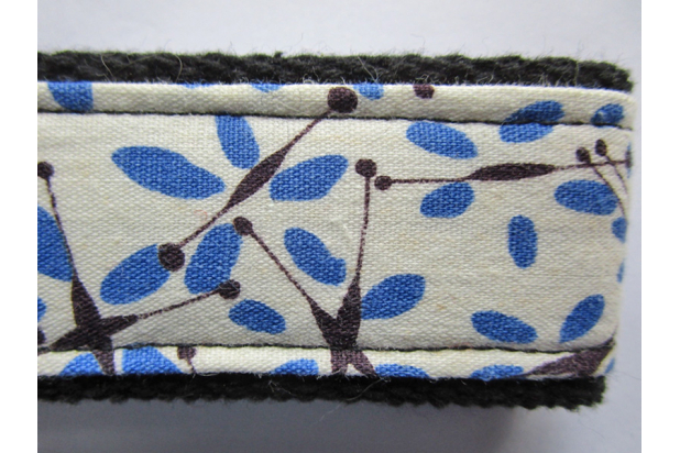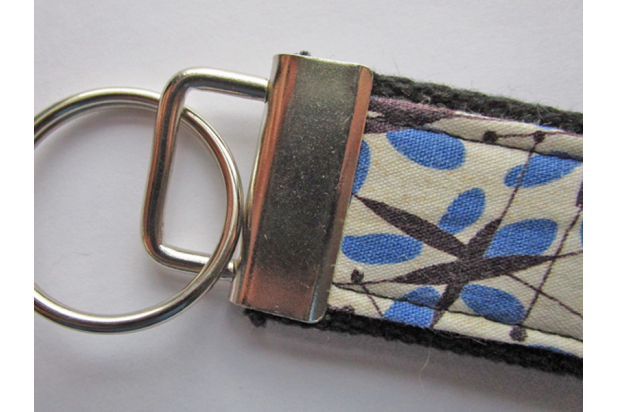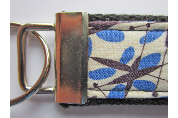 Made from 1.25" black cotton webbing and decorated with a vintage atomic fabric in blue and black on a white background, this 5" long key fob can be worn as a wristlet. It has nickel hardware and an attached ring for your keys. These key holders make it super easy to find your keys especially if you chose a bright color.