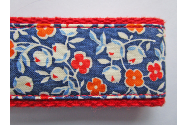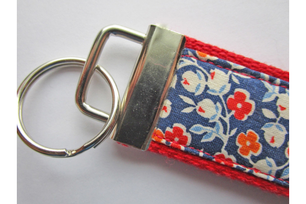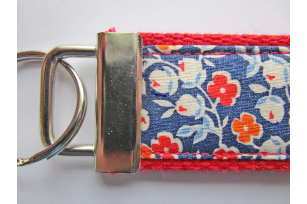 Made from 1.25" bright red cotton webbing and decorated with a vintage floral fabric featuring flowers in red, white, and light blue on dark blue, this 5" long key fob can be worn as a wristlet. It has nickel hardware and an attached ring for your keys. These key holders make it super easy to find your keys especially if you chose a bright color.