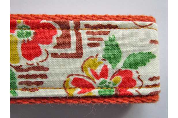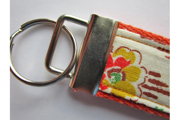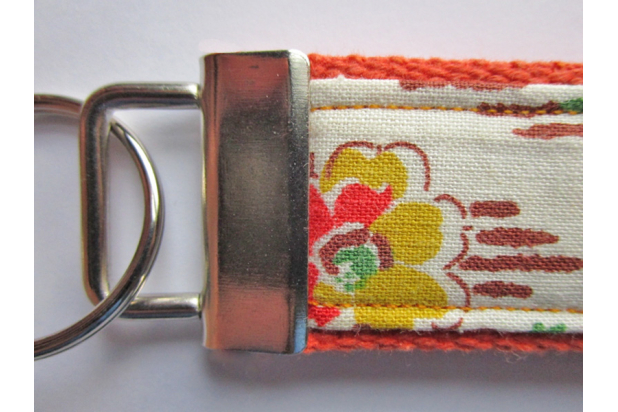 Made from 1.25" red cotton webbing and decorated with a vintage fabric with blue background and scattered roses in pink, red, green, and dark blue, this 5" long key fob can be worn as a wristlet. It has nickel hardware and an attached ring for your keys.