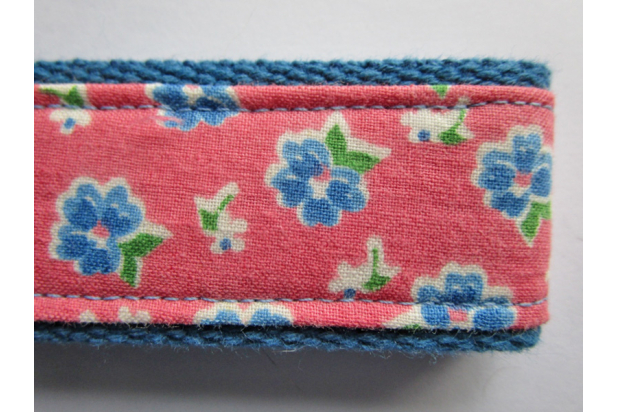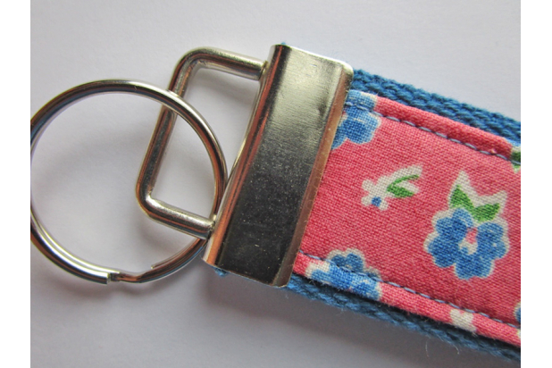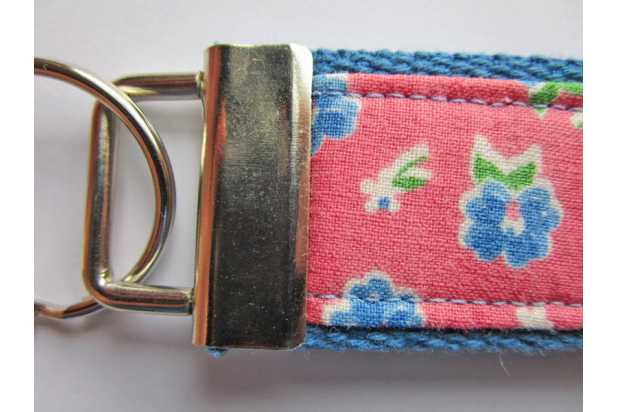 Made from 1.25" blue cotton webbing and decorated with a vintage fabric with blue and white flowers and green leaves on a deep pink background, this 5" long key fob can be worn as a wristlet. It has nickel hardware and an attached ring for your keys. These key holders make it super easy to find your keys especially if you chose a bright color.