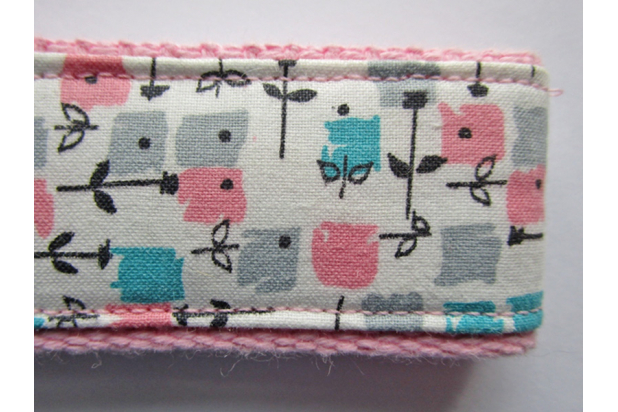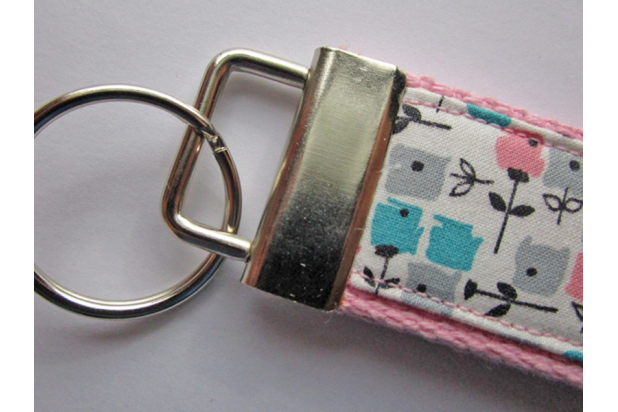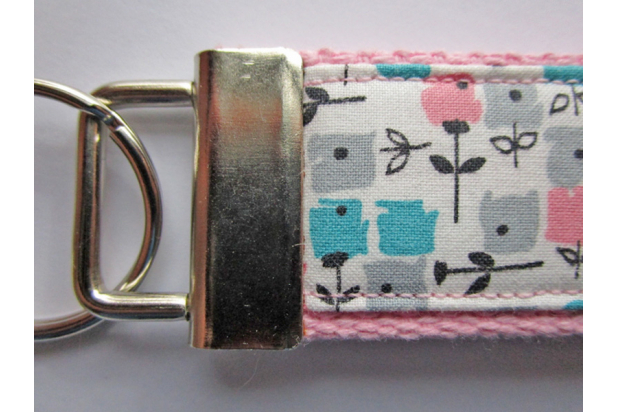 Made from 1.25" light pink cotton webbing and decorated with a vintage fabric with flowers in blue, gray, and pink on a white background, this 5" long key fob can be worn as a wristlet. It has nickel hardware and an attached ring for your keys. These key holders make it super easy to find your keys especially if you chose a bright color.