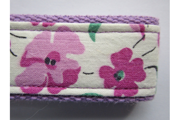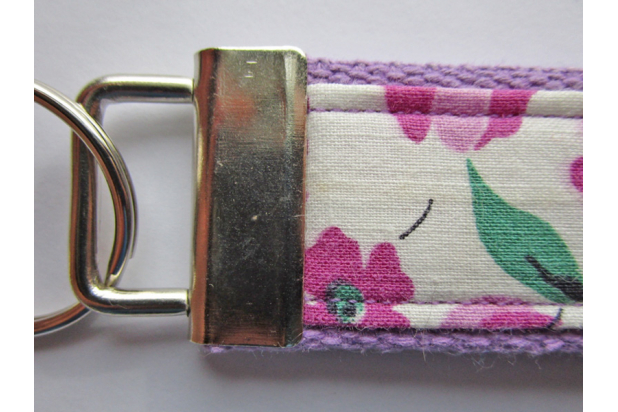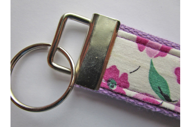 Made from 1.25" light purple cotton webbing and decorated with a vintage floral fabric featuring flowers in purple and green on white, this 5" long key fob can be worn as a wristlet. It has nickel hardware and an attached ring for your keys. These key holders make it super easy to find your keys especially if you chose a bright color.